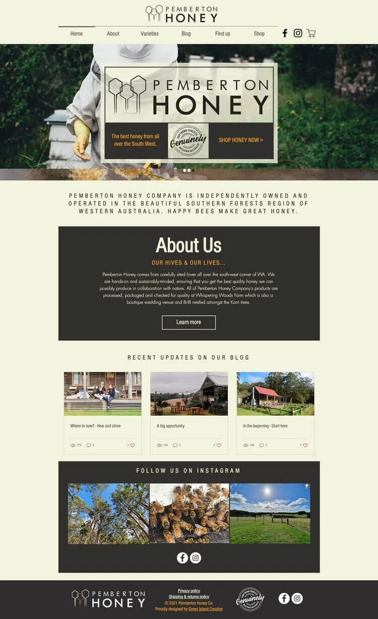 Considering the multicultural market, we incorporated recognisable symbology that reflected the landscape; the towering Karri forests that the Pemberton region is famous for and the hexagonal honeycomb combined. We used a deep brown and rich honey colour scheme captured from photographic reference from the beehives and product itself and wove this into an approachable looking website Pemberton Honey Co. website.