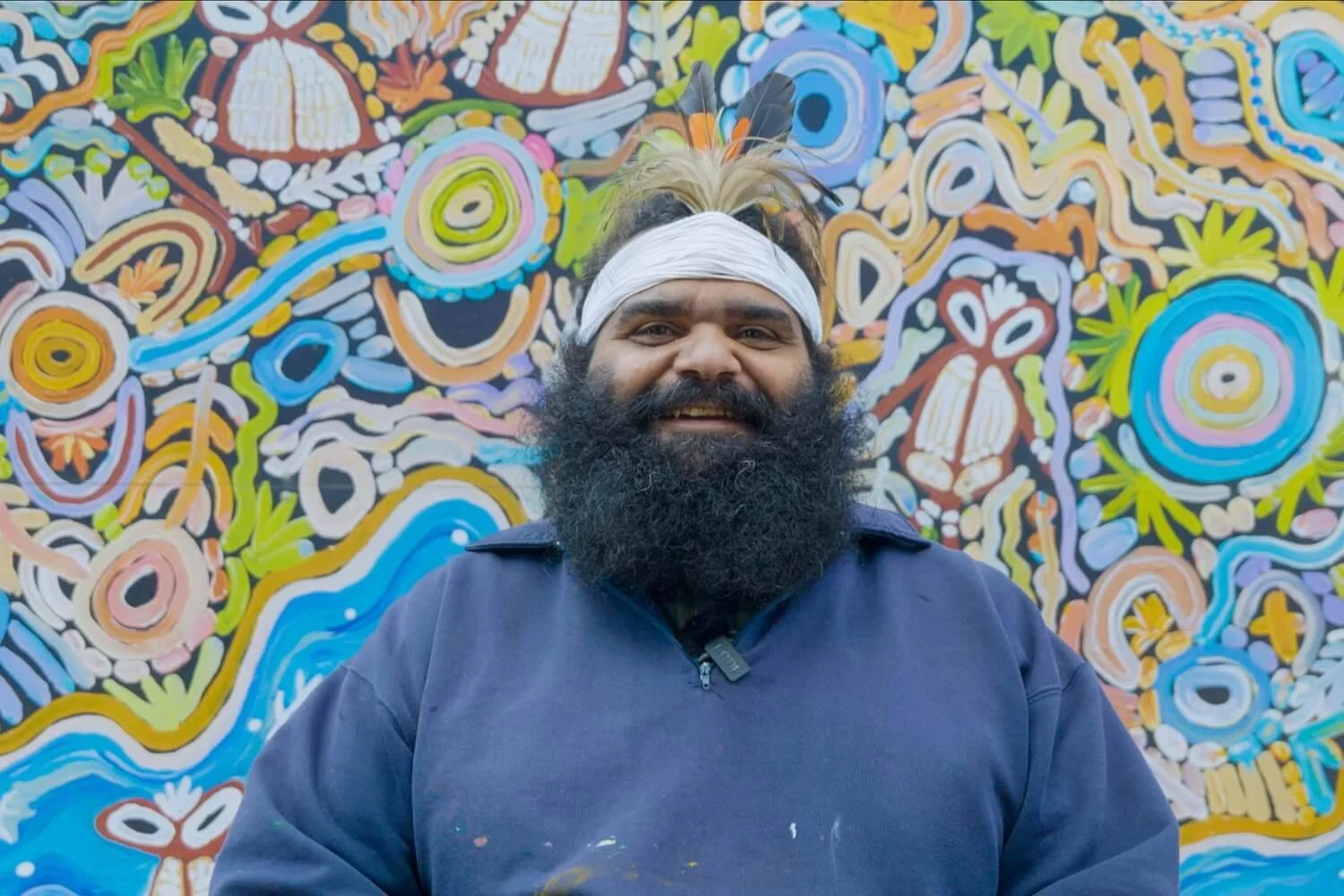 Artist Cedric Varcoe in front of his mural ‘Dreaming of our Lands and Waters’